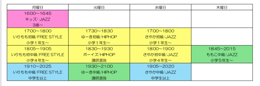 【いりもも初級、いりもも初中級、ゆーき初級、ボーイズ、さやか初級、さやか初中級】